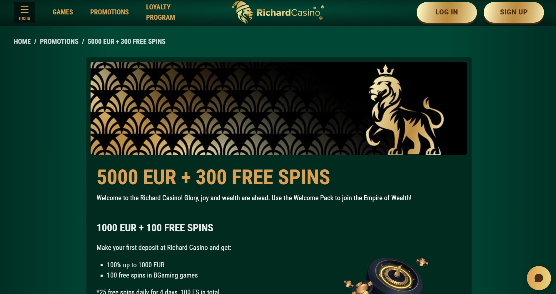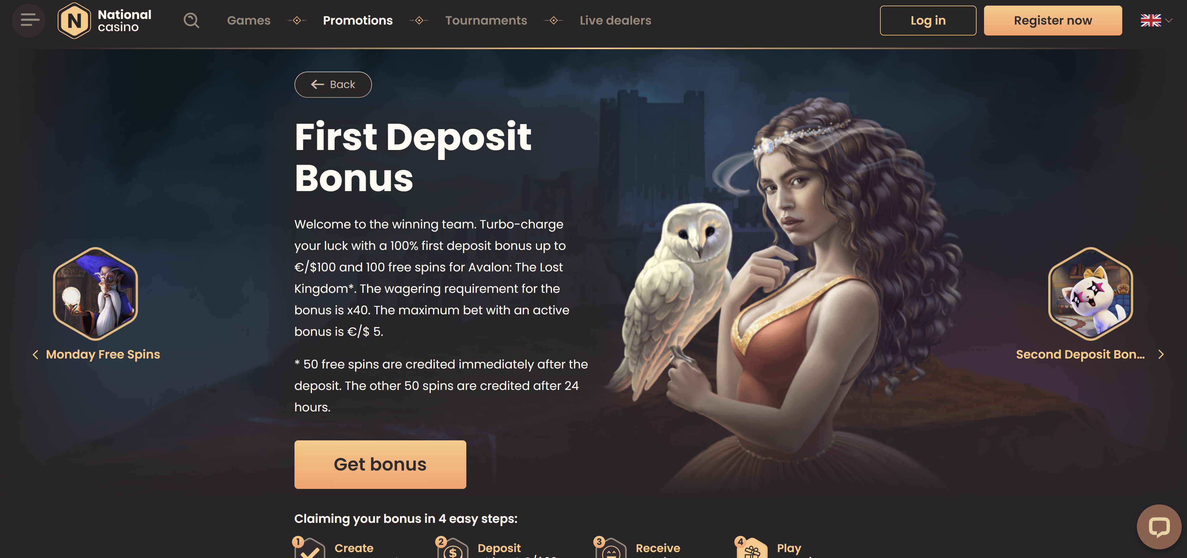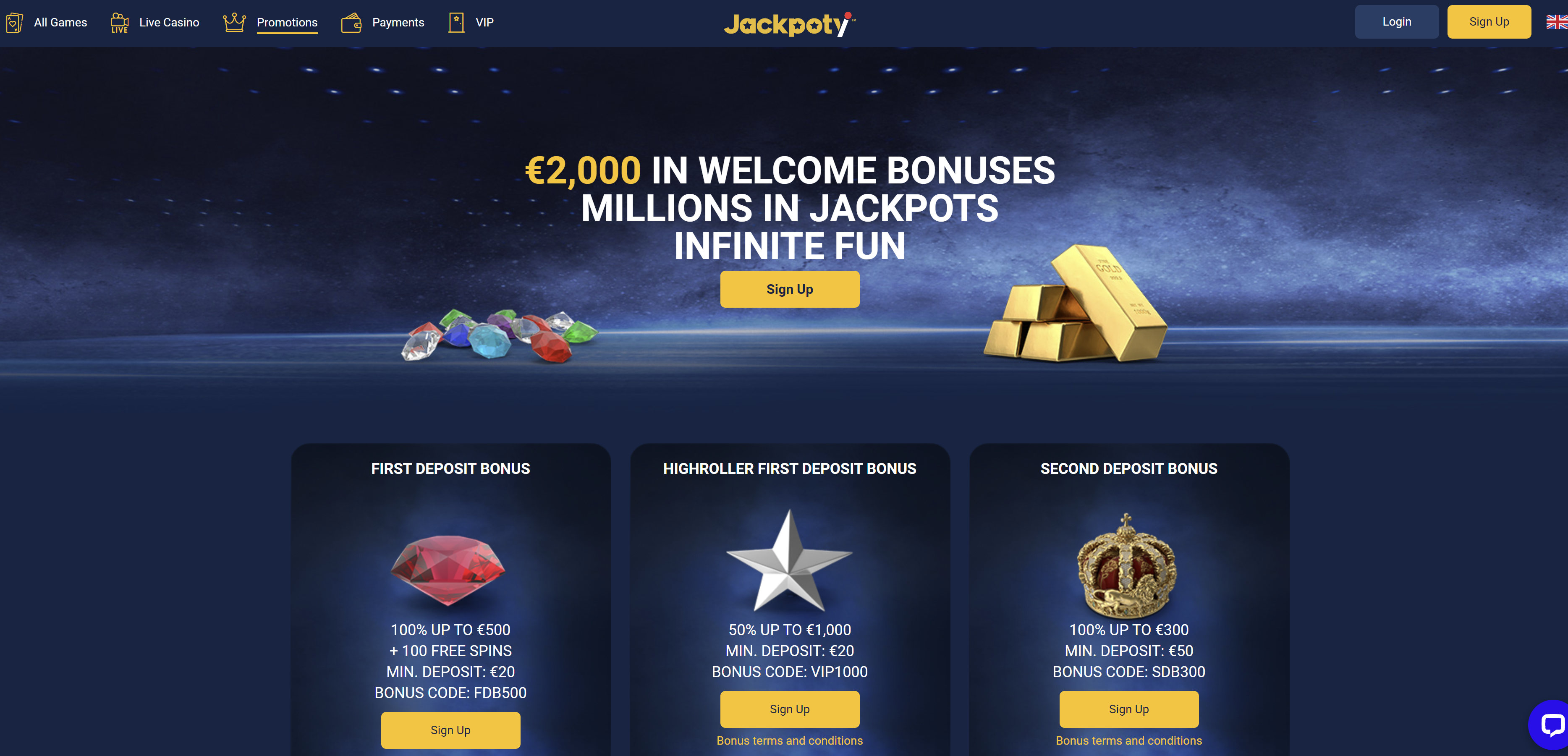- The first deposit comes with a 100% match up to €300 and includes 100 free spins. The minimum deposit starts at €20, and no bonus code is required at this stage.